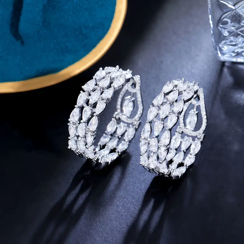Bold and dazzling, these thick gold-tone earrings are encrusted with sparkling white zircons on both sides. Their elegant triple-layer circular design adds a sophisticated touch of glamour, making them perfect for weddings, formal events, and special occasions.